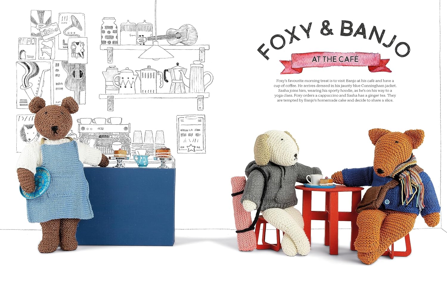 Follow Foxy and his friends as they set off on adventures near and far and learn to knit them, their clothes and accessories. The designs and illustrations have a quirky, original style and Foxy himself exudes understated cool – whether he’s kicking back and listening to his vinyl collection at home or enjoying a macchiato with Banjo at his favourite coffee house.
