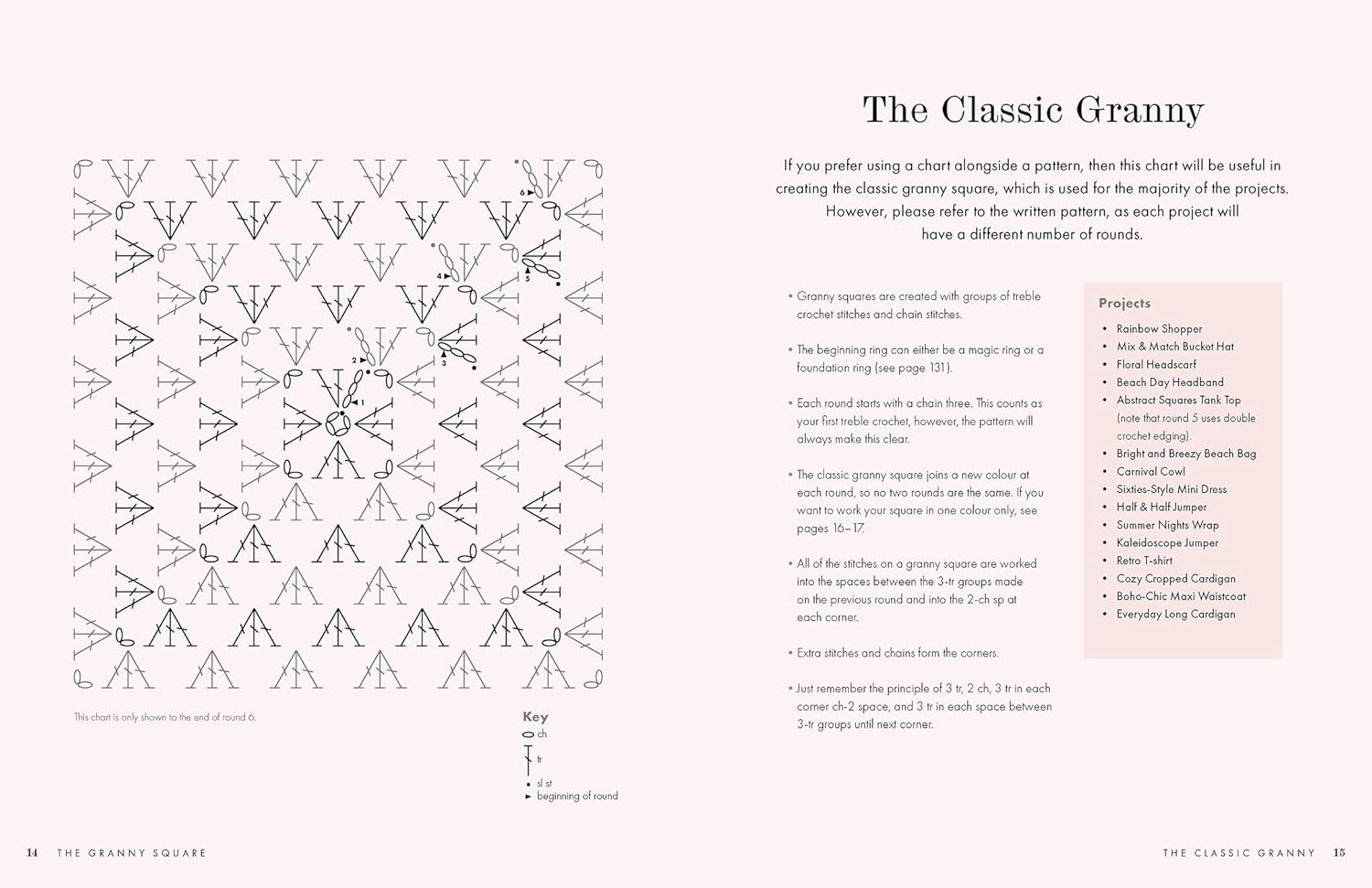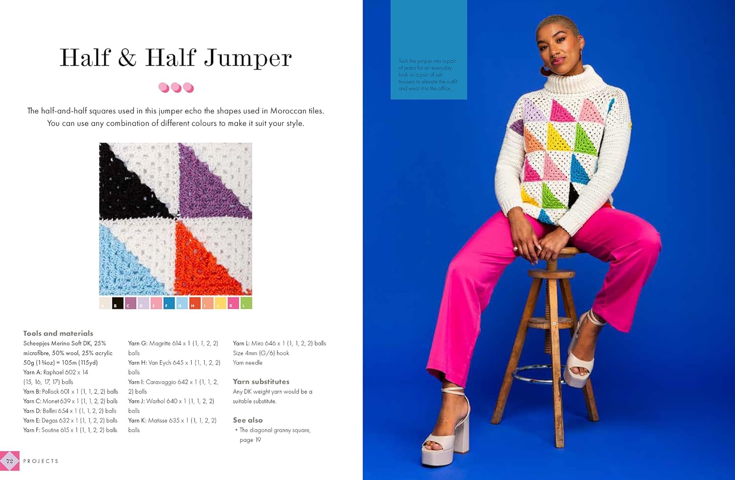 - Step-by-step instructions for making the basic granny square, half-granny, and diagonal half, and how to change colours while crocheting.