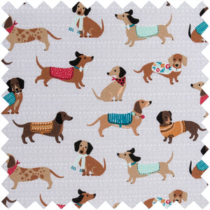 Small rectangular wicker sewing box with linen covered lid in a classic Sewing Notions print.
